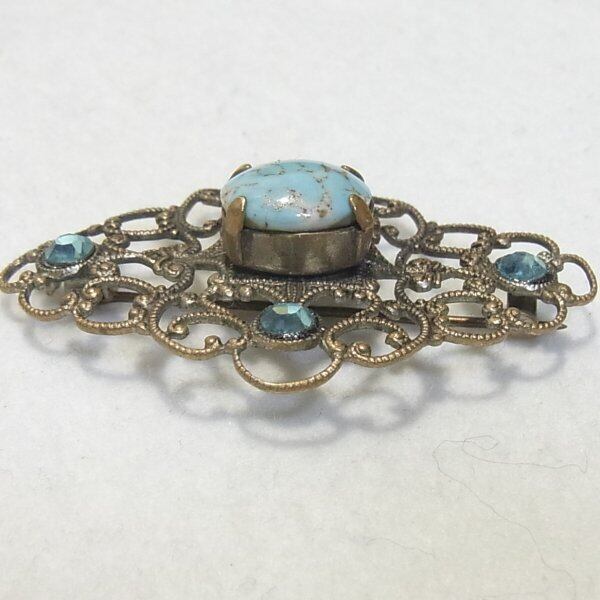 ターコイズガラスの石の透かしデザインのブローチ ヴィンテージブローチのセール通販 10599B