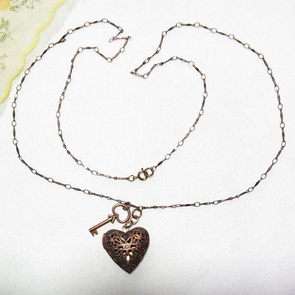 ●2000’s ●ハートにキーのロケットペンダントネックレス 銅製のペンダント 銅製のロングチェーン 55cm スタイリッシュでオシャレ きれいなオールドストック新品