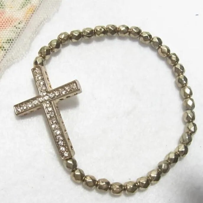 ●オールドストック品 ●十字架の付いたストレッチブレスレット クリアなラインストーン ゴールドトーンのメタルビーズ ゴムひもでストレッチします
