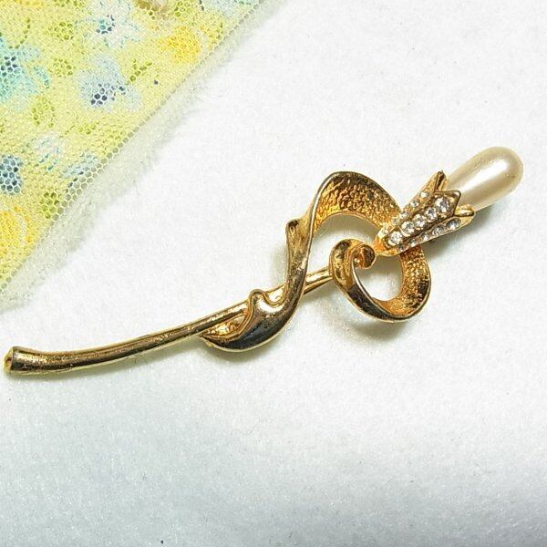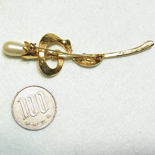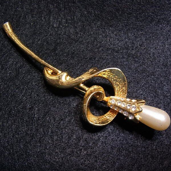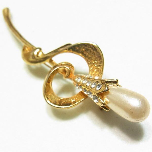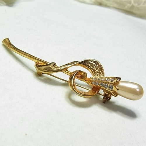 ●2000s ●フラワーブローチ クリアなラインストーン 白いパール加工のプラスティック ゴールドトーンのメタル製 気品あふれるきれいなアイテムです ◆年代は当店の推定です。