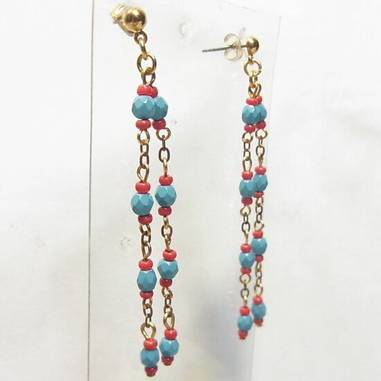 ●オールドストック新品 ●水色・赤ガラスビーズの長い下がるピアス ゴールドトーンのメタル金具 リラックス感のあるキュートなアイテムです ★送料は一律250円、4000円以上お買い上げで無料です。
