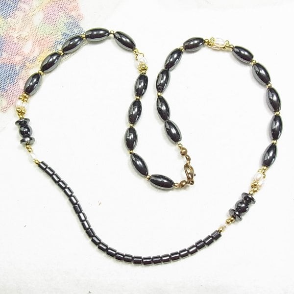 ●2000s ●天然石、ヘマタイトと淡水真珠のビーズネックレス 60cm 清楚できれいなアイテムです ◆年代は当店の推定です。