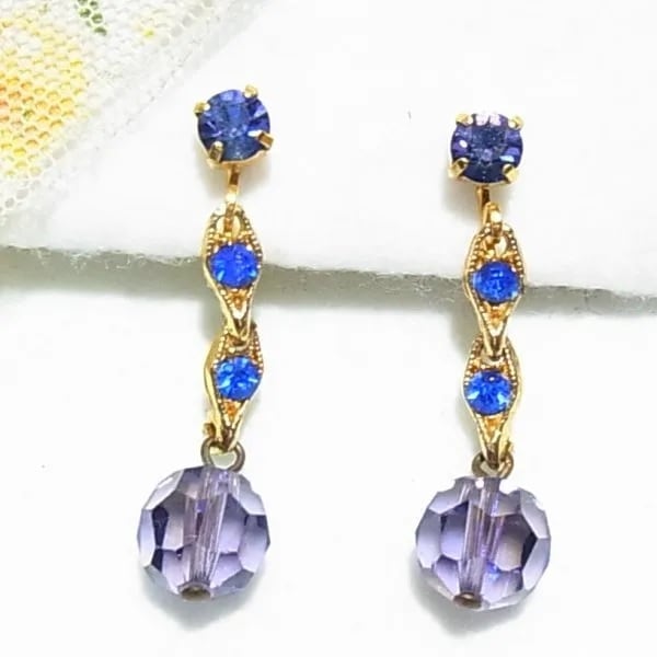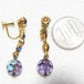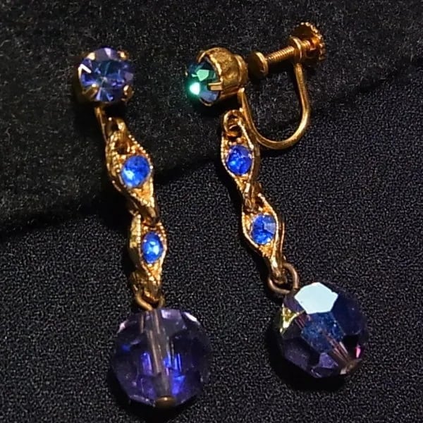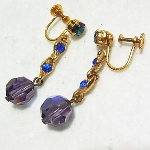 ●1980’s ●ねじ式 ●パープルガラスビーズの下がるイヤリング ブルーのラインストーン ゴールドトーンのメタル製 上品でオシャレ、きれいです ◆年代は当店の推定です。