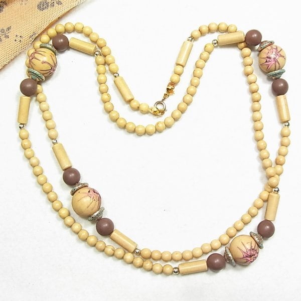 ●1980s ●木製のビーズ製ロングネックレス 金色メタル金具 103cm 二回巻きで良い長さになります きれいです ◆年代は当店の推定です。 ◆この商品は、古い時代のビンテージアイテムです。