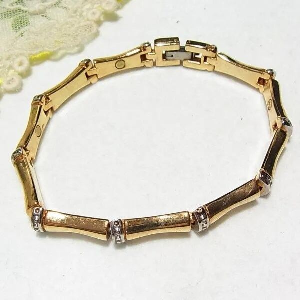 ●1990ー2000s ●光沢メタルのバーが繋がるブレスレット ゴールドトーンのメタル製 間にシルバートーンメタルのコンビ 標準的な長さ きれいなオールドストック新品です ◆年代は当店の推定です。