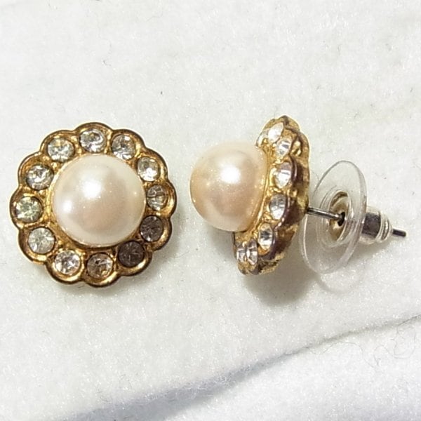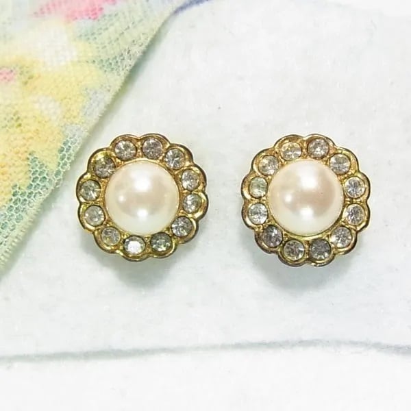 ●2000s ●模造パールとクリアなラインストーンのラウンドピアス ゴールドトーンのメタル製 きれいです ◆年代は当店の推定です。