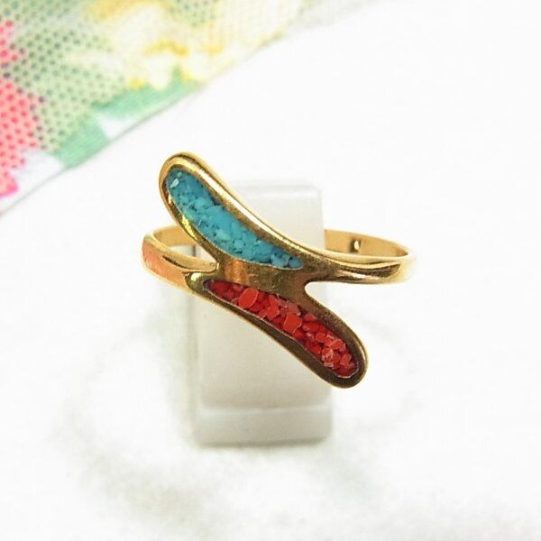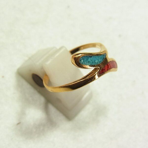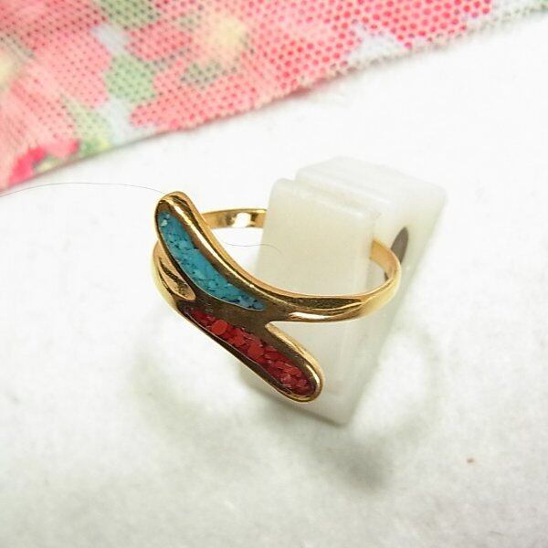 金色メタルにトルコ石と珊瑚の欠片インレーリング size 14 アクセサリーのセール通販 11503R