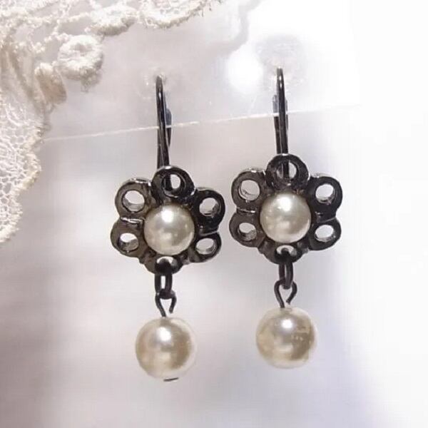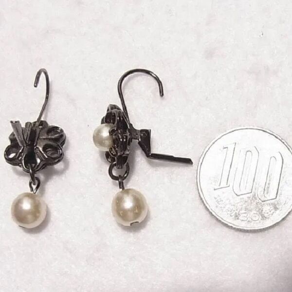 ●2000’s ●パール風ビーズが下がる黒メタルピアス 黑いメタル製 レバーバックのピアスフック 個性的な良いムード アレルギー対応はしておりません 当店の品はいずれも欧米からのインポート品です