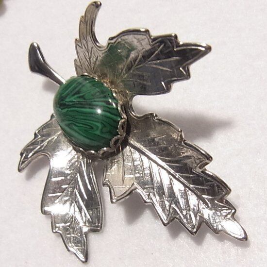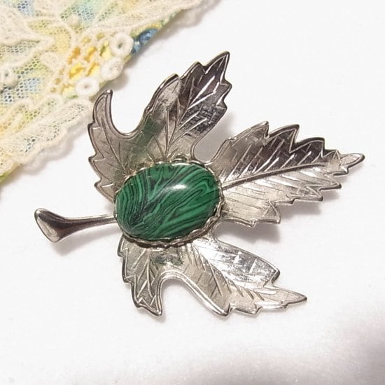 ●マラカイト(孔雀石)の付いたメープルリーフのブローチ