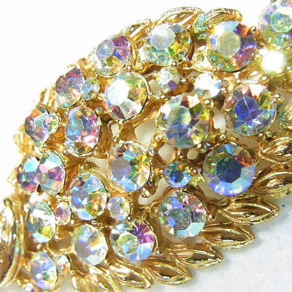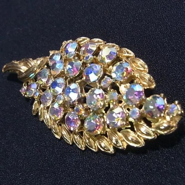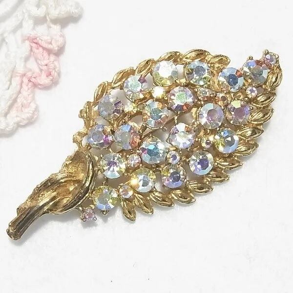 ●オーロララインストーンのリーフ・フラワーブローチ