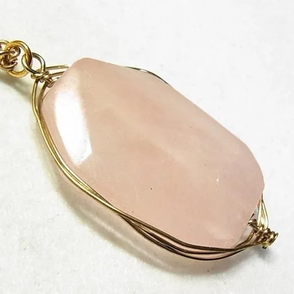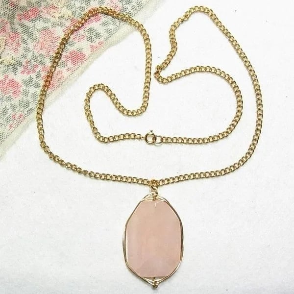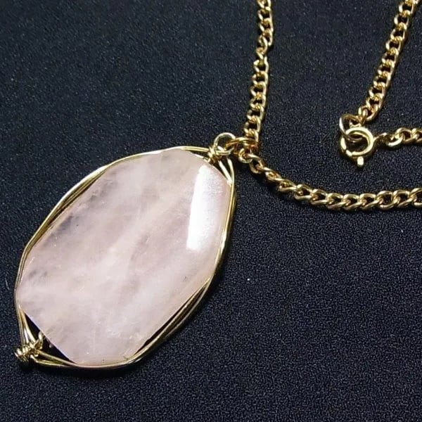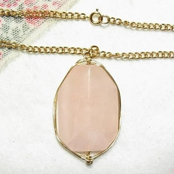 ●2000s ●天然石、ローズクォーツのペンダントネックレス ゴールドトーンのメタル枠とチェーン 61cmチェーン 石の大きさ、3.7 x 2.5 x 0.8cm