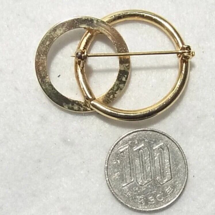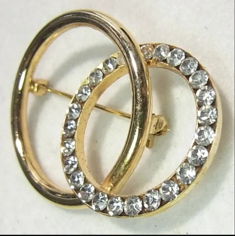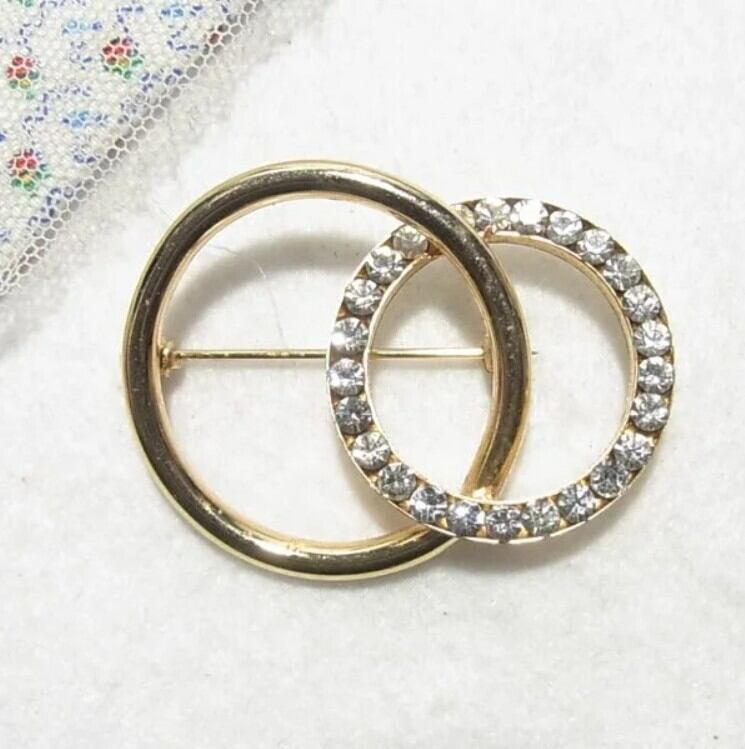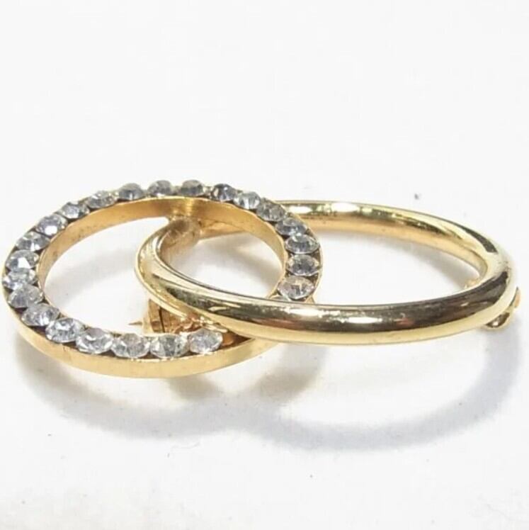 ●1990-2000’s ●2サークルブローチ ゴールドトーンの光沢のあるメタル製 クリアなラインストーン きれいに輝く清楚なアイテムです ◆年代は当店の推定です。