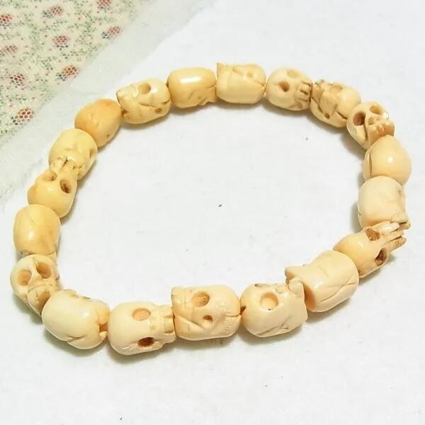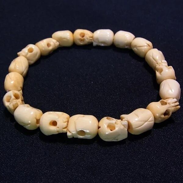 ●新品 ●ボーン(動物の骨)でスカル(骸骨)を彫ったビーズ製、ストレッチブレスレット ゴムひもでストレッチします。 幅約8mmのスカルビーズ ユニークで個性的なアイテムです