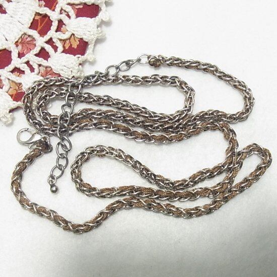 ●オールドストック新品 ●銀色メタルチェーンにファブリックの ブラウンのひもを編み込んだチェーンネックレス 個性的なロングチェーン 78~86cm 1回、2回巻きで使用できます。