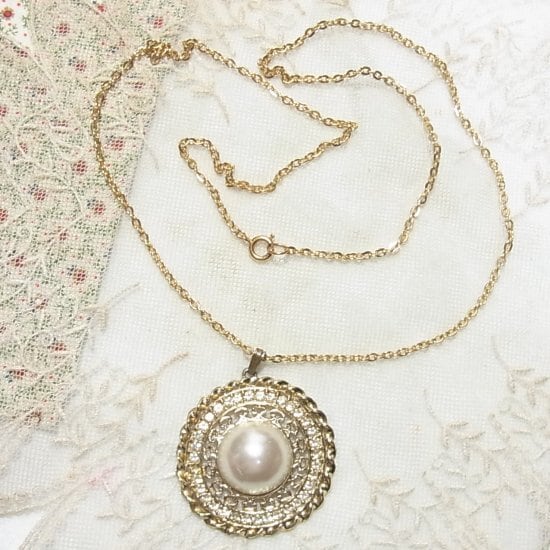 ●ラインストーンとカボションパール風の石のラウンドペンダントネックレス
