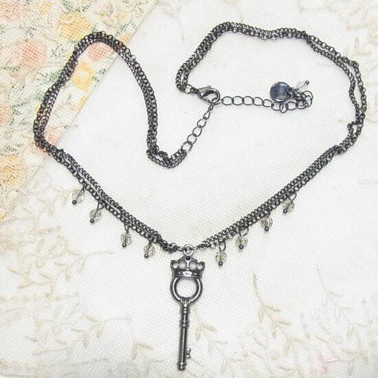 ●新品 ●キーのペンダントネックレス クリアなガラスビーズ 黒いメタルチェーン2連 43~50cmのアジャスタブル オシャレなアイテムです。