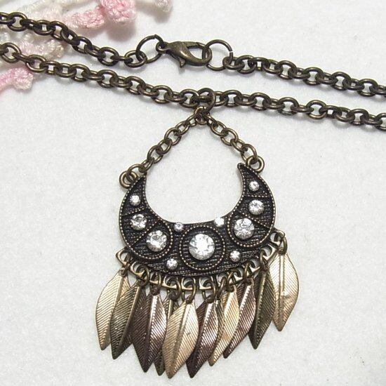●オールドストック新品 ●葉っぱが下がるペンダントネックレス ブロンズカラーメタル クリアなラインストーン 56cmチェーン シックな色合いのオシャレなアイテムです