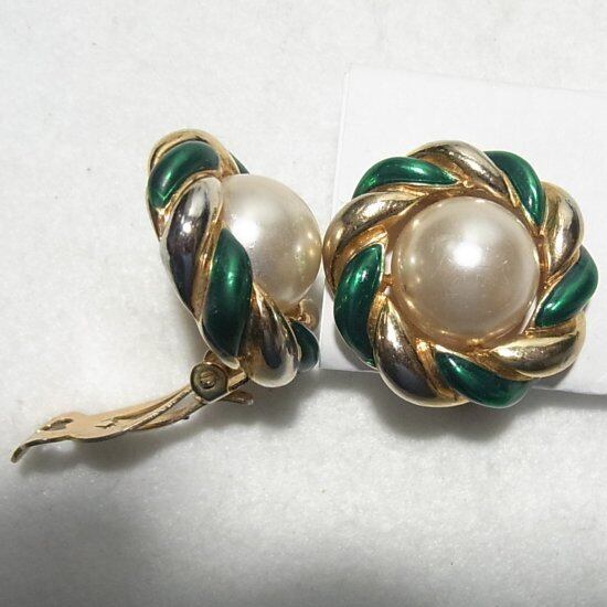 ●オールドストック新品 ●クリップ式 ●グリーンのエナメルのラウンドイヤリング ゴールドトーンのメタル製にエナメルペイント パール風のカボションの石 個性的な良いムードです。