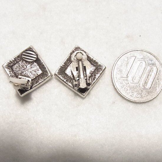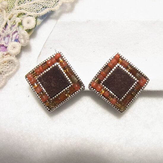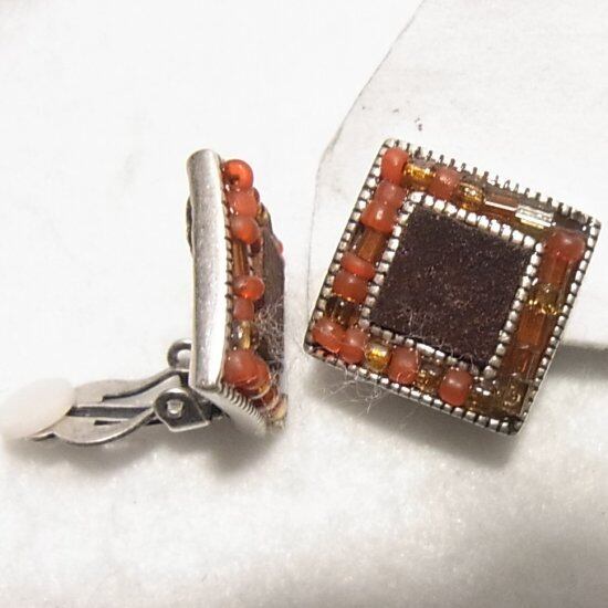 ●オールドストック新品 ●クリップ式イヤリング ●四角いイヤリング オレンジのガラスビーズ センターにこげ茶のプラスティック シルバートーンのメタル製 変わった作りのきれいなアイテムです 。