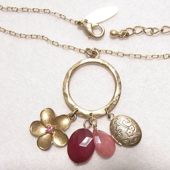 ●オールドストック新品 ●チャームが下がるペンダントネックレス フラワー、ピンクとレッドのガラス、蓋が開くロケット ゴールドトーンのメタル製 40~46cm きれい、プリティなアイテムです