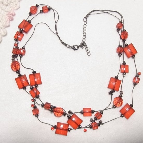 ●オールドストック新品 ●赤茶色のビーズ3連ネックレス プラスティックビーズ 黒いメタルチェーン 内側の連で46~53cmのアジャスタブル ★送料は一律250円、4000円以上お買い上げで無料です。