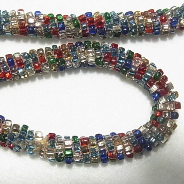 小さいガラスビーズをひも状に編みこんだ凝った作り