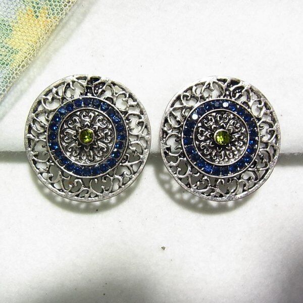 ●オールドストック新品 ●クリップイヤリング ●透かしデザインのラウンドイヤリング ブルーとグリーンのラインストーン シルバートーンのメタル製 スタイリッシュでオシャレなアイテムです