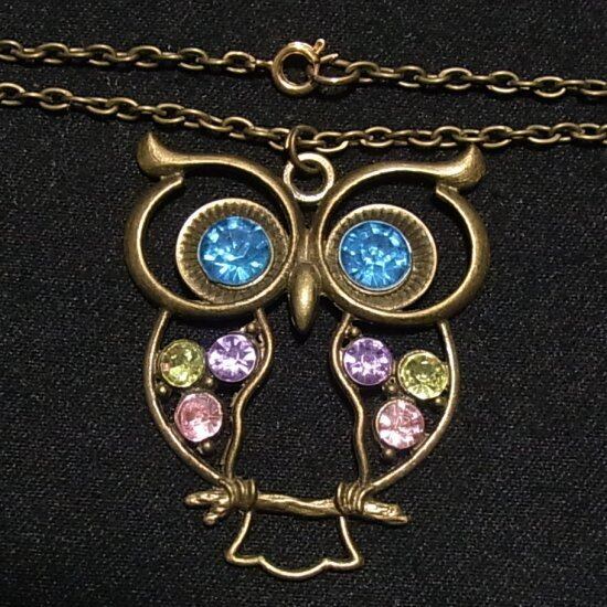 ●オールドストック新品 ●フクロウのペンダントネックレス ブロンズカラーメタル カラフルラインストーン 63cmチェーン キュートなアイテムです