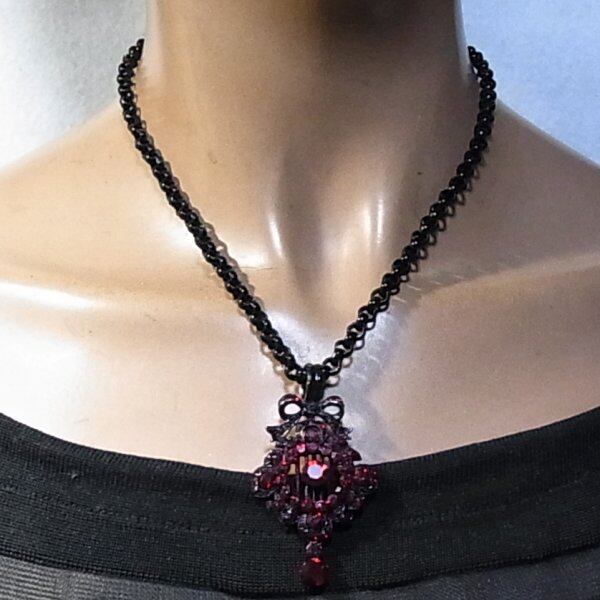 ●黒チェーンに赤いラインストーンペンダントのネックレス