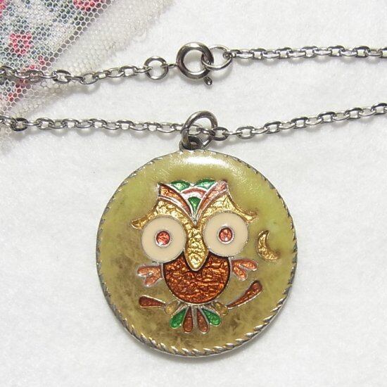 裏がミラーになったエナメルのフクロウのペンダントネックレス ヴィンテージアクセサリーのセール通販 9666N